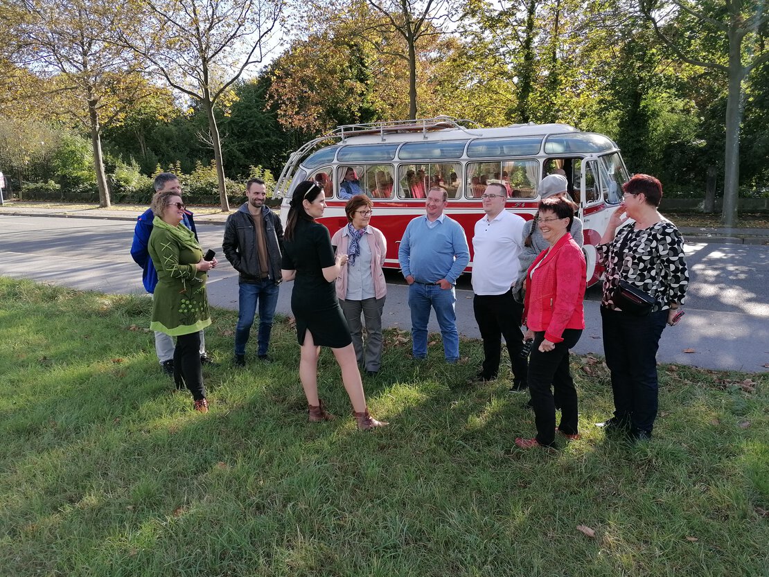 Pünktlich 14 Uhr wartete ein historischer Bus vor der Tür, um uns mit auf eine interessante Stadtführung der etwas anderen Art durch Dresden zu nehmen. In den folgenden kurzweiligen zwei Stunden erfuhren wir eine Menge über interessante Orte in Dresden, hatten Gelegenheit zu weiterem Austausch und waren nebenbei die Touristenattraktion des Tages.